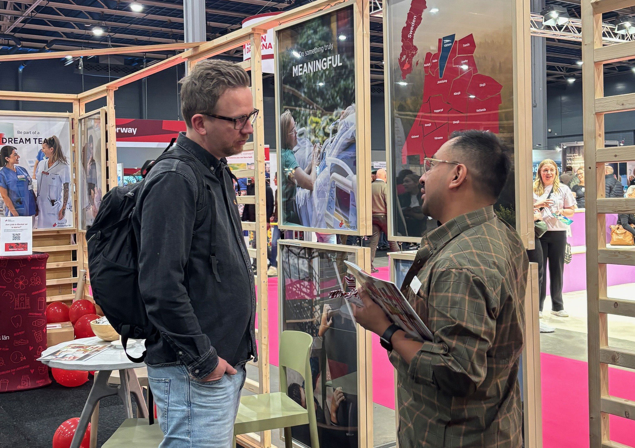 Turism- och destinationsutvecklare Johan Svedberg samtalar med en mässbesökare.